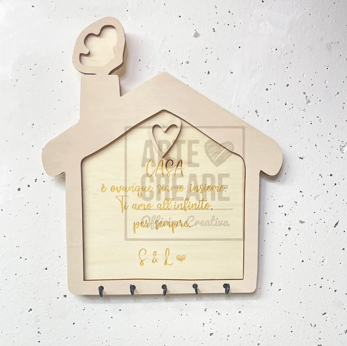 Realizzata con cura in legno di alta qualità, questa casetta si adatta perfettamente a qualsiasi ambiente domestico. I ganci metallici offrono uno spazio organizzato per appendere le chiavi in modo sicuro, mentre il design inciso aggiunge un tocco di fascino e significato.