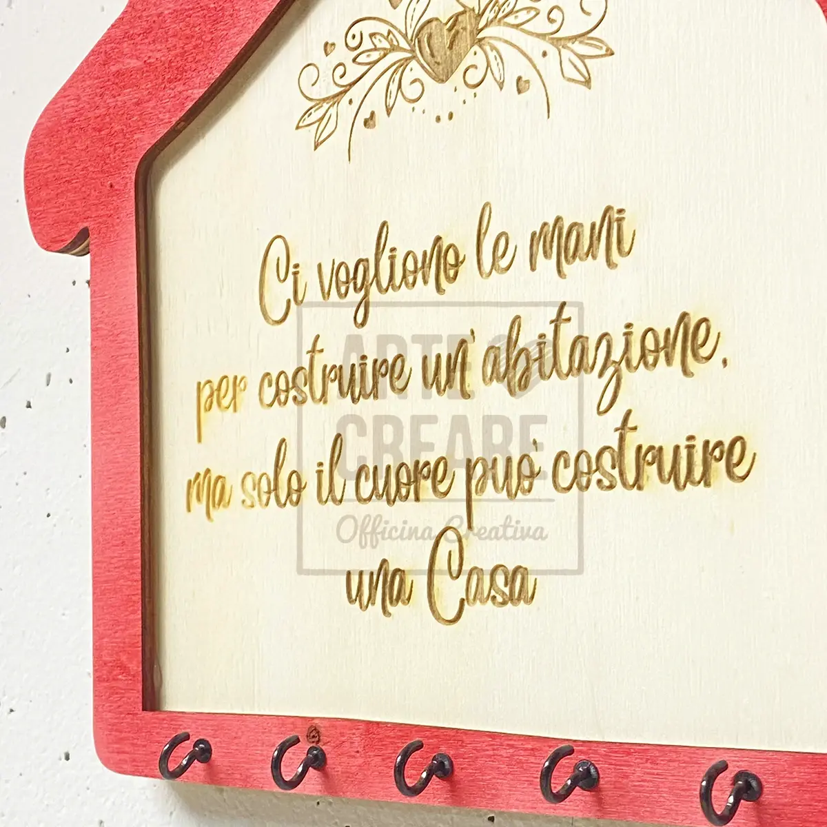 Realizzata con cura in legno di alta qualità, questa casetta si adatta perfettamente a qualsiasi ambiente domestico. I ganci metallici offrono uno spazio organizzato per appendere le chiavi in modo sicuro, mentre il design inciso aggiunge un tocco di fascino e significato.