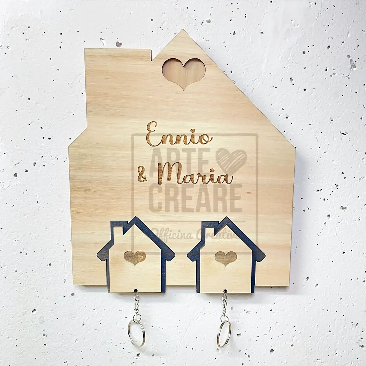 Organizza le chiavi di casa con stile e affetto grazie alla casetta portachiavi Famiglia con spazio per 2 soggetti personalizzabili. Realizzata in legno naturale con grafica pulita e accogliente, questa casetta appendichiavi è perfetta per custodire le chiavi del tuo nido e celebrare i legami più importanti.
