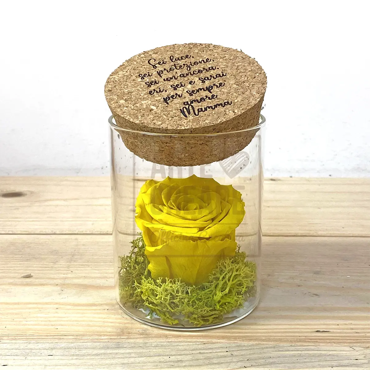 Un dono che va oltre il tempo: una rosa eterna stabilizzata, racchiusa in un elegante vaso di vetro con tappo in sughero inciso.