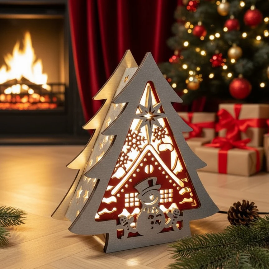 Realizzata in legno di alta qualità, questa lampada decorativa diffonde una luce soffusa e avvolgente, ideale per addobbare salotti, ingressi, vetrine o tavoli natalizi.