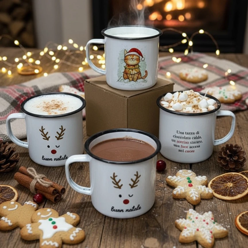 Rendi magico il tuo inverno con queste splendide tazze natalizie in metallo smaltato, decorate con illustrazioni dolci e festive: un simpatico gattino con cappello di Natale, una renna stilizzata e una frase motivazionale che celebra la magia delle piccole cose.